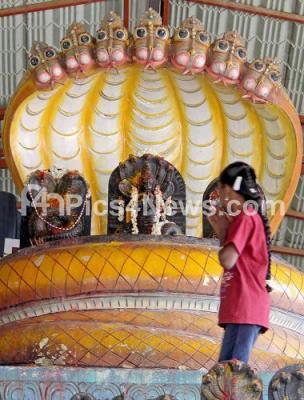 Photo Caption : People performing pooja to celebrate “Nagapanchami†festival at Mukti Naga Temple, in Bengaluru on Friday 28th July 2017