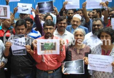 Photo Caption : Employees of the Information and Technology (IT) industry hold placards against layoffs and alleged unfair labour practices by Indian IT Companies during a protest demonstration organised by Information Technology Employees Union at Freedom Park, in Bengaluru on Saturday 29th July 2017