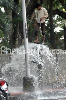 Photo Caption : Cascading Cauvery water out flows from the control valve, as the Valve man decompresses its valve to let out for the accumulated air, following the disruption of water service for almost three days, for easy flow of water onwards journey from one valve to another at Millers Road Near UT College, in Bengaluru on Monday 31st July 2017