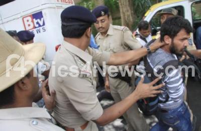 Photo Caption : Police personnel trying to control the media outside the residence of Karnataka Energy Minister DK Shivakumar during the Income Tax raids investigation at Sadashivnagar, in Bengaluru on Wednesday 2nd August 2017