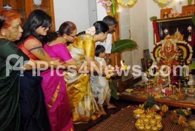 Photo Caption : Senior Actress Tara and her husband performing lakshmi pooja on the occasion of Varamahalakshmi festival at her residence, in Bengaluru on Friday 4th August 2017