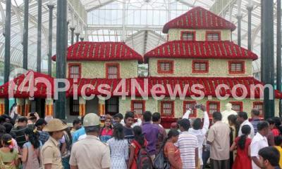 Visitors enjoying at the floral replica of Rashtrakavi Kuvepu house “Kavishala” during the inauguration of Independence Day flower show at Glass House, Lalbhag, in Bengaluru on Friday 4th August 2017