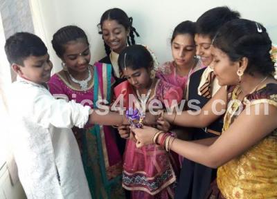 Photo Caption : Children seen tying sacred thread rakhi at the Raksha Bandhan Utsav program at Bharatiya Vidya Bhavan, Okalipuram, organised by Bharatiya Vidya Bhavan and Bharatha Vikasa Parishat, in Bengaluru on Monday 7th August 2017
