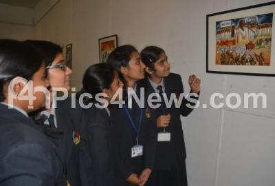 Students seen admiring the painting exhibition on Independence Day at Venkatappa Art Gallery, organised by Heritage Foundation of Art and Culture, in Bengaluru on Monday 14th August 2017