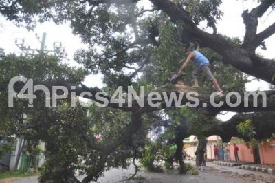 Uprooted tree being cleared at Nandi Durga Road, after the Overnight heavy rainfall wreck havoc in Bengaluru City, in Bengaluru on Tuesday 15th August 2017