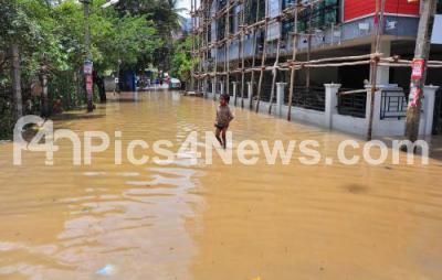 Photo Caption : Rain water logged in the shops at Ashwini Layout, Koramangala,, after the overnight heavy rainfall wreck havoc in Bengaluru City, in Bengaluru on Tuesday 15th August 2017