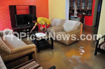 Photo Caption : Sunil Kumar, a resident shows the water logged inside his residence at Ashwini Layout, Koramangala, after the overnight heavy rainfall wreck havoc in Bengaluru City, in Bengaluru on Tuesday 15th August 2017