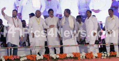 Photo Caption : Congress Vice President Rahul Gandhi seen with CM Siddaramaiah, Congress Leader Mallikarjuna Kharge and others at the Congress Public Meeting at National College Grounds, in Bengaluru on Wednesday 16th August 2017