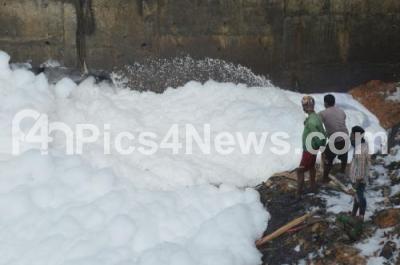 Photo Caption : Workers seen trying to control the Toxic and dangerous foam by spraying water, which has increased at Bellandur Lake due to recent heavy rains and heavy inflow of water, in Bengaluru on Thursday 17th August 2017