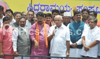 Photo Caption : BJP Leaders Jagadish Shetter, R Ashoka, KS Eshwarappa, Prahalad Joshi, Jagadish Shetter, Muralidhar Rao and others led by BJP State President BS Yeddyurappa protesting against State Congress Govt at Freedom Park, in Bengaluru on Friday 18th August 2017