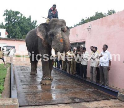 Photo Caption : Dasara elephants being weighed on a electronic weigh bridge, before the festivities start for the Dasara Festival 2017, in Mysuru on Friday 18th August 2017