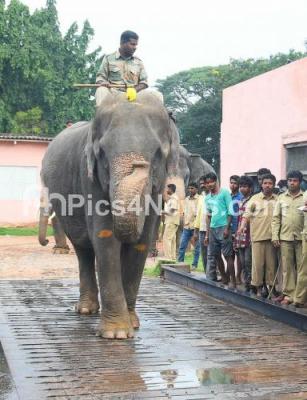 Photo Caption : Dasara elephants being weighed on a electronic weigh bridge, before the festivities start for the Dasara Festival 2017, in Mysuru on Friday 18th August 2017