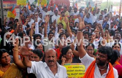 Photo Caption : BJP leaders, workers and supporters protesting against Congress Govt at SBM Circle, in Bengaluru on Sunday 20th August 2017