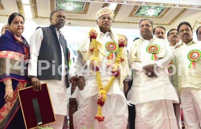 Photo Caption : CM Siddaramaiah presenting “Devraj Urs†award to MP Mallikarjuna Kharge during Former CM Devraj Urs birth anniversary programme at Banquet Hall, Vidhana Soudha, also seen are Minister Anjaneya and others, in Bengaluru on Sunday 20th August 2017