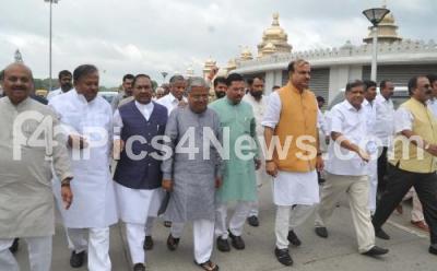 BJP Leaders Jagadish Shetter, Arvind Limbvali, Pralhad Joshi, K S Eshwarappa, Basavaraj Bommai and others led by Union Minister Anantkumar arriving at Raj Bhavan submitting memorandum to Governor regarding on misuse of the police authority by the state government, in Bengaluru on Monday 21st August 2017