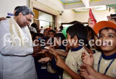 Photo Caption : CM Siddaramaiah seen giving autograph to the visiting school students at Vidhan Soudha, in Bengaluru on Monday 21st August 2017