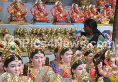 Photo Caption : People seen purchasing the Gowri Ganesha idols for the upcoming Gowri Ganesha Festival at RV Road, in Bengaluru on Tuesday 22nd August 2017