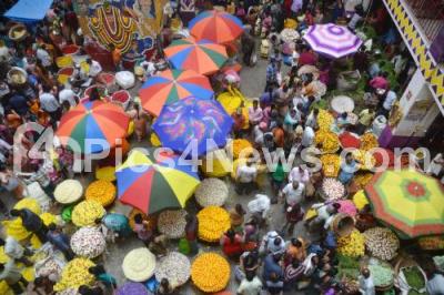 Photo Caption : KR market is bustling with people shopping for Gowri Ganesha Festival, in Bengaluru on Tuesday 22nd August 2017