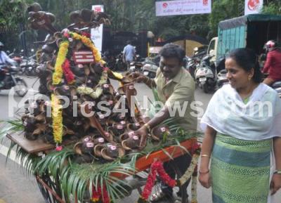 Event Description : Eco friendly Ganesha idols being made of Electra Tree Shells by Vidya Sagar, were kept on display near Press Club for the upcoming Gowri Ganesha Festival, in Bengaluru on Wednesday 23rd August 2017