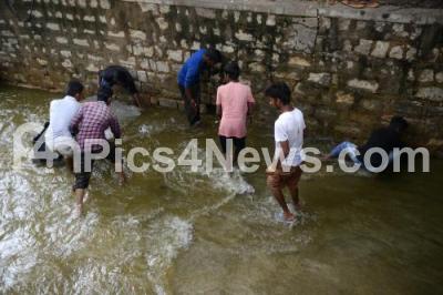 Photo Caption : People fishing in the raju kaluve (drainage) due to overflowing of Madiwala lake and due last night heavy rain in the city, in Bengaluru on Thursday 24th August 2017