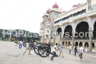 Photo Caption : Canons at Mysore Palace being cleaned as preparations are underway for Mysore Dasara celebration, in Mysuru on Saturday 26th August 2017