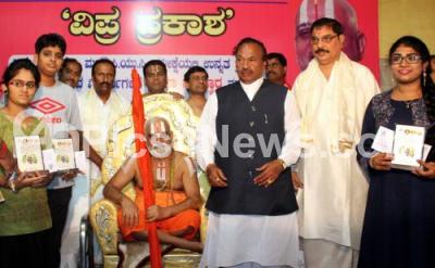 Photo Caption : MLC K S Eshwarappa presenting pratiba puraskara to the SSLC and PUC toppers at a programme organized by Malleswaram Bramana Sabha, Malleswaram, also seen are Sri Yadugiri Yatiraja Naryana Ramanuja Jiyar Swamiji and others, in Bengaluru on Sunday 27th August 2017