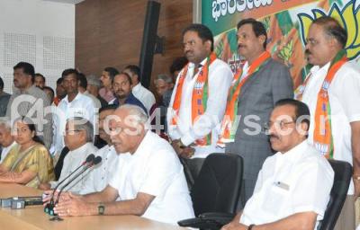 Photo Caption : BJP State President BS Yeddiyurappa addressing press conference after joining Congress leaders Varaprasad Reddy BJP at BJP office, also seen are Union Minister DV Sadananda Gowda, BJP State In Charger Muralidhar Rao, MP Shoba Karandlaje, in Bengaluru on Sunday 27th August 2017