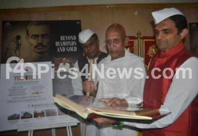 Event Description : Rajendran, Head Marketing, C Krishnaiah Chetty Group with Someshekhar, dressed like Mahatma Gandhiji and Himanshu, Shrimad Rajchandraji Mission, addressing a press conference on the upcoming play “Yugpurush” on Mahatma Gandhi and his mentor Shrimad Rajchandraji to be performed at Chowdiaiah Memorial Hall on 1st September, the press conference was held at Press Club, in Bengaluru on Monday 28th August 2017