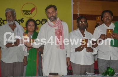 Photo Caption : Yogendra Yadav, National President of Swaraj India Party with Devanur Mahadeva, Writer, MLA Puttananaih and others releasing a handbook of Swaraj India during the interactive meeting on Democracy at Gandhi Bhavan, in Bengaluru on Tuesday 29th August 2017