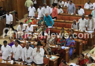 Photo Caption : Congress Councilors seen arguing regarding the increasing H1N1, Dengue cases and Garbage issue during the BBMP Council Session at BBMP, in Bengaluru on Wednesday 30th August 2017