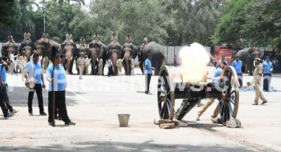Photo Caption : Canon shots fired in the presence of Dasara elephants as part of the Dasara 2017 festivities in Mysuru on Friday 8th September 2017
