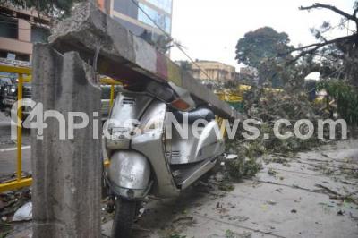Photo Caption : Electricity pole fell down on two wheeler at Sajjan Rao circle due to last night heavy wind rainfall, in Bengaluru on Saturday 9th September 2017