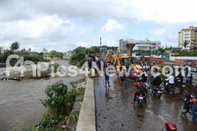 Photo Caption : Rescue team in action at the spot where two KSRTC bus, cement mixing vehicle and car stuck in the flood on Mysuru Road Higway, near Kengeri, after heavy rainfall whole night in the city, in Bengaluru on Sunday 10th September 2017