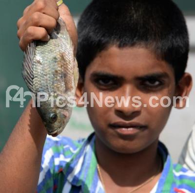 Photo Caption : A boy showing fish which was caught in the flood, due to heavy rainfall whole night in the city, in Bengaluru on Sunday 10th September 2017