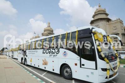 Photo Caption : Chief Minister Siddaramaih with Transport Minister HM Revanna and others flagged off the new Airavat Club Class Buses in front of Vidhan Soudha, in Bengaluru on Wednesday 13th September 2017
