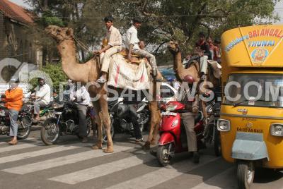 Photo Caption : The increasing traffic in the city seems to have not spared these camels too. A camel rider waits for the green signal near Okkalipuram Circle, in Bangalore on Thursday 6th Dec 2007.