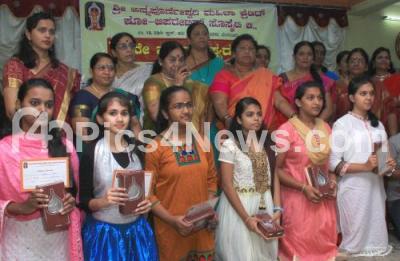 Photo Caption : Mayor G Padmavathi presenting pratiba puraskara to SSLC and PUC toppers at a programme organized by Sri Annapoorneshwarai Mahila Credit Co operative Society at Rajaji Nagar, in Bengaluru on Sunday 17th September 2017