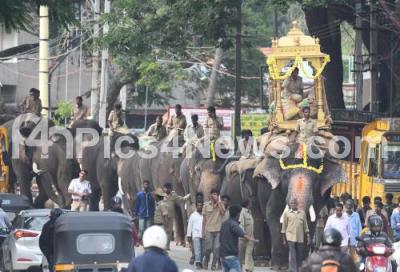 Photo Caption : Dasara elephant carried the Wooden Howdah along with other Dasara elephants during a rehearsal for the Dasara Festival in Mysuru City on Monday 18th September 2017
