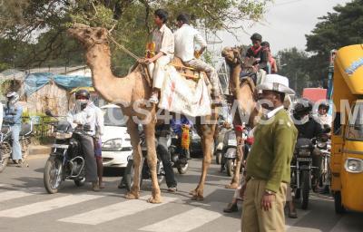 Photo Caption : The increasing traffic in the city seems to have not spared these camels too. A camel rider waits for the green signal near Okkalipuram Circle, in Bangalore on Thursday 6th Dec 2007.
