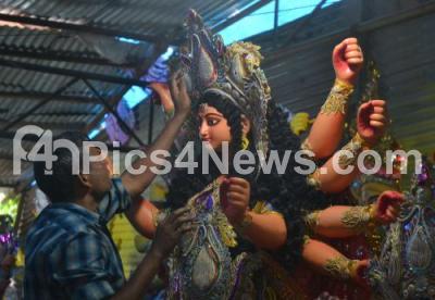 Photo Caption : Artist seen giving final touches to Goddess Durga Idol for the upcoming Navrathri Festival Celebration at Ramkrishnappa Road, near Cox Town, in Bengaluru on Wednesday 20th September 2017