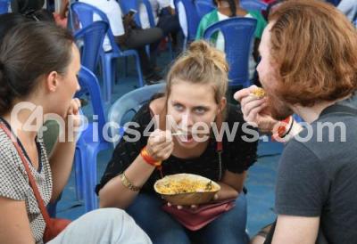 Photo Caption : Foreigners having bamboo biryani during food mela as part of the Dasara 2017 celebrations, in Mysuru on Sunday 24th September 2017