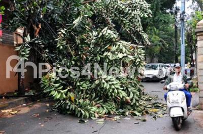 Photo Caption : A tree branch uprooted on the compound wall due to last night rain in the city, in Bengaluru on Monday 25th September 2017