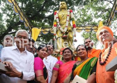 Minister DK Shivakumar with Mayor Padmavathi, Shivarudra Belimutt Swamiji, Nanjavadhoota Swamiji and others unveiled the statue of Lakshmidevi, Daughter in lAw of Nada Prabhu Kempegowda at BBMP campus, in Bengaluru on Tuesday 26th September 2017