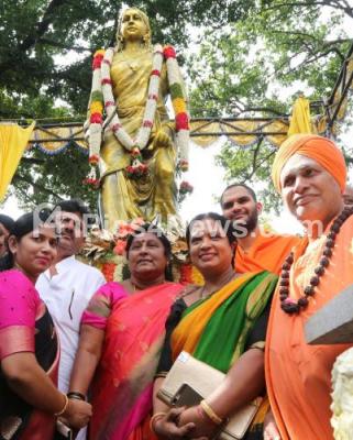 Photo Caption : Minister DK Shivakumar with Mayor Padmavathi, Shivarudra Belimutt Swamiji, Nanjavadhoota Swamiji and others unveiled the statue of Lakshmidevi, Daughter in lAw of Nada Prabhu Kempegowda at BBMP campus, in Bengaluru on Tuesday 26th September 2017