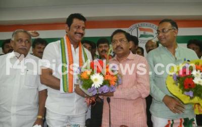Photo Caption : Rajshekhar Kotian being greeted by Dr G Parameshwar, KPCC President, MLAs Dinesh Gundu Rao, Abhay Chandra Jain after joining the Congress party at KPCC Office, in Bengaluru on Wednesday 27th September 2017