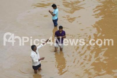 Photo Caption : People seen taking selfies at the water logged road due to last night heavy rainfall at Makali, Tumkur Road, in Bengaluru on Wednesday 27th September 2017