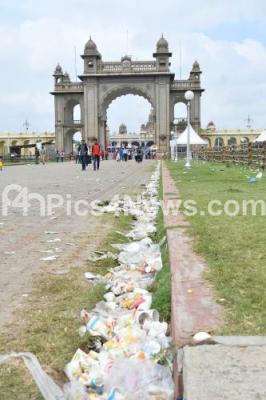 Photo Caption : Garbage lying in front of Mysuru Palace after Dasara festivities, in Mysuru on Sunday 1st October 2017