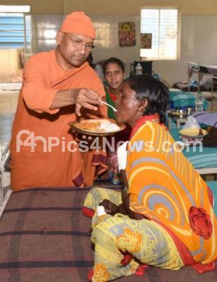 Photo Caption : Swami Japanadaji Maharaj serving food to the patients during distribution of clothes, self care kit and appliances to Leprosy Hospital patients , on the occasion of Father of the Nation Mahatma Gandhi’s 113th Birth Anniversary at Leprosy Hospital, Magadi Road, in Bengaluru on Monday 2nd October 2017
