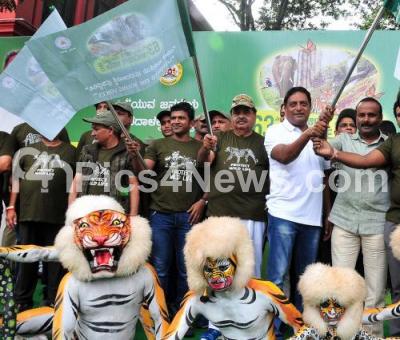 Photo Caption : Forest Minister Ramanat Rai with Actors Prakash Raj, Puneet Rajkumar, Mayor R Sampath Raj and volunteers participated in walk for conservation of wildlife on the eve of 63rd Wildlife week 2017 at Cubbon Park, in Bengaluru on Monday 2nd October 2017