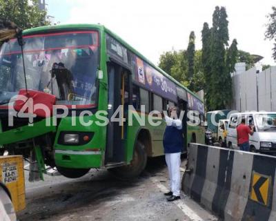 Photo Caption : A BMTC bus met with an accident by hitting the divider, due to break failure at Kasturba Road, in Bengaluru on Tuesday 3rd October 2017